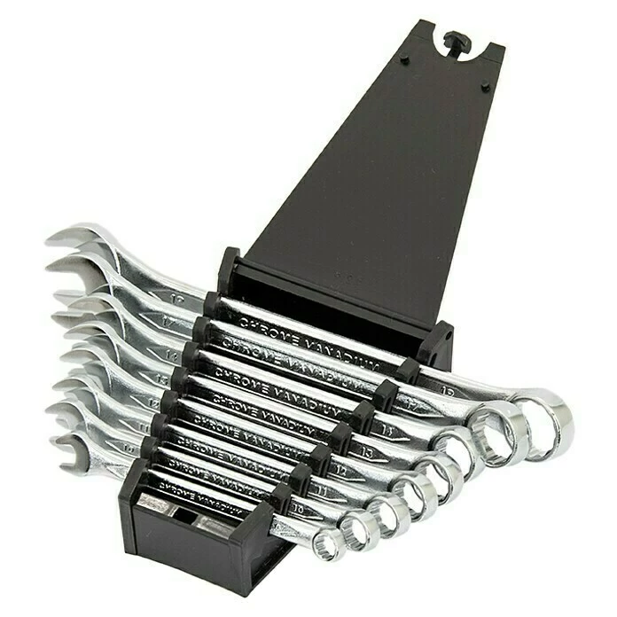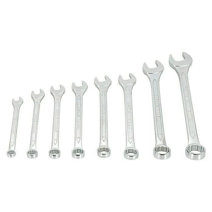 Der Alpha Tools Ringmaulschlüssel-Satz besteht aus 8 Schlüsseln. Sie sind aus Chrom-Vanadium-Stahl gefertigt und in Größen 8, 10, 11, 12, 13, 14, 17, 19 vertreten. Die Schlüssel entsprechen der DIN 3113.
