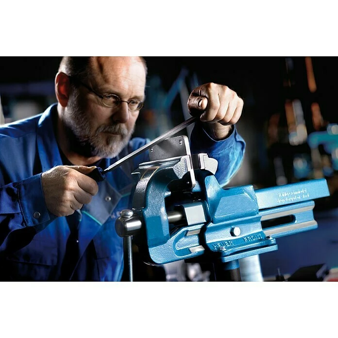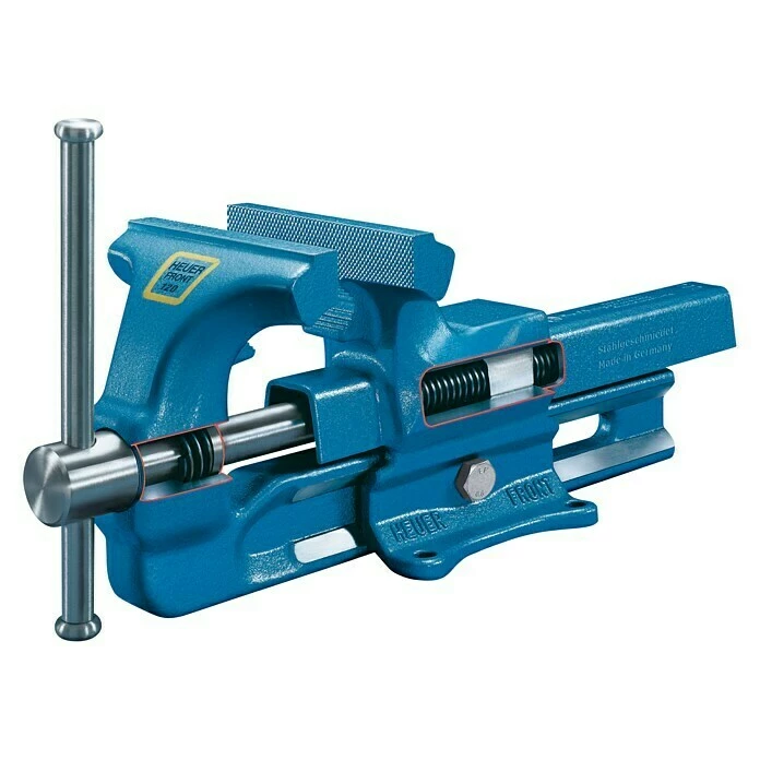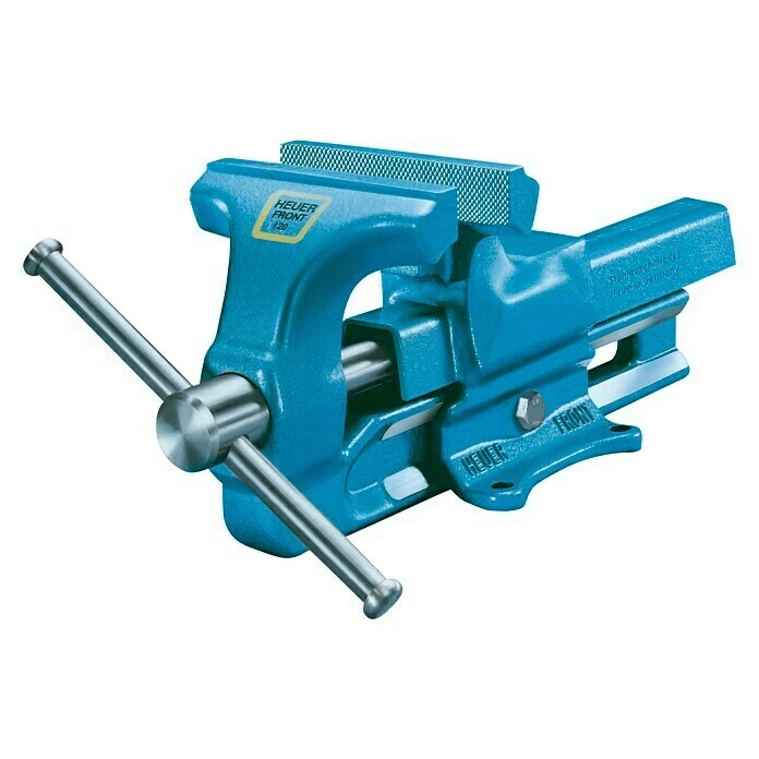 Der Heuer Schraubstock ist ein echtes Qualitätswerkzeug. Ganz aus Stahl geschmiedet, garantiert unzerbrechlich. Er besteht aus mehreren gesenkgeschmiedeten Einzelteilen. Die Vorderbacke wird mit der Führungsschiene und die Hinterbacke mit den Laschen verschweißt. So entsteht das patentierte, nach vorn öffnende System des Erfinders Josef Heuer. Aufgrund der schlanken, im Gesenk geschmiedeten Führungsschiene bietet der Schraubstock eine große Tiefspannmöglichkeit. Die doppelte, innenliegende Prismenführung ist vor Beschädigung und Verschmutzung bestens geschützt. Große, allseitig bearbeitete Führungsflächen garantieren einen stetig präzisen, leichtgängigen Lauf der Führungsschiene, unablässig beim exakten Einspannen von empfindlichen Werkstücken. Ein weiteres Plus ist die geschützte Präzisionsspindellagerung, die abgedeckte, galvanisch verzinkte Spindel mit zweigängigem, gerolltem Trapezgewinde, sowie die einfach nachstellbare, zentrische Führung. Diese Konstruktion ist für die hohe Präzision maßgebend. Die Spindelbauart sorgt zudem für eine höhere Festigkeit durch die Kaltverformung, eine geringe Oberflächenrauigkeit auf den Gewindeflanken und im Grundradius sowie eine verminderte Kerbempfindlichkeit. Durch das galvanische Verzinken ist die Spindel vor Korrosion geschützt. Die vernieteten Sicherungsringe am Spindelschlüssel aus Stahl geben dabei die notwendige Sicherheit. Ein Amboss ist in die Hinterbacke integriert. Der Heuer Schraubstock ist aufgrund seiner hochwertigen und durchdachten Verarbeitung ein Musterbeispiel an Zuverlässigkeit und Langlebigkeit. Ideal für den rauen Werkstattbetrieb. Eben „Made in Germany“.