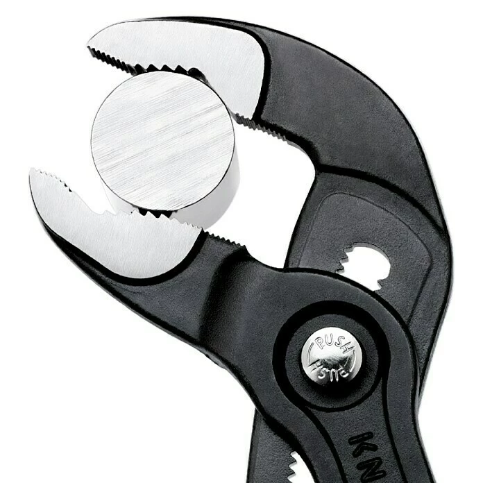 Die Cobra Wasserpumpenzange von Knipex lässt sich per Knopfdruck schnell direkt am Werkstück einstellen und sorgt durch ihre Feinverstellung für eine optimale Anpassung an verschiedene Werkstückgrößen und eine handfreundliche Griffstellung. Die Zange ist selbstklemmend an Rohren und Muttern, wodurch ein Abrutschen am Werkstück verhindert und kraftsparendes Arbeiten ermöglicht wird. Die Greifflächen zeichnen sich durch die spezialgehärteten Zähne und ihre hohe Verschleißfestigkeit aus. Zudem ist das durchgestreckte Gelenk durch die doppelte Führung besonders stabil. Ein zusätzlicher Klemmschutz verhindert Quetschverletzungen.