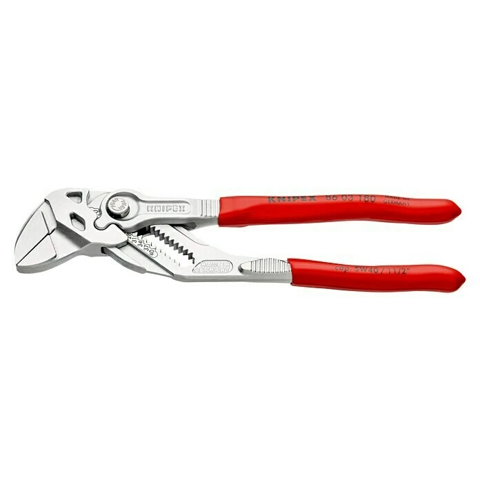 Der einstellbare Zangenschlüssel von Knipex eignet sich hervorragend zum Greifen, Halten, Pressen und Biegen von Werkstücken und ersetzt dadurch einen Satz Schraubenschlüssel, metrisch wie zöllig. Dank glatter und parallel geführter Greifbacken lässt er sich nicht nur zur schonenden Montage von oberflächenveredelten Armaturen einsetzen, sondern es ist auch ein stufenloses Greifen aller Schlüsselweiten bis zur angegebenen Kapazität möglich. Die Einstellung am Werkstück erfolgt per Knopfdruck. Durch sicheres Einrasten des Gelenkbolzens wird eine unbeabsichtigte Verstellung verhindert. Der Hub zwischen den Greifbacken ermöglicht zudem ein schnelles Anziehen und Lösen von Schraubverbindungen nach dem Ratschenprinzip, ohne dass die Zange abgesetzt werden muss. Außerdem besitzt dieser Zangenschlüssel eine hohe Klemmkraft durch seine zehnfache Handkraftverstärkung.