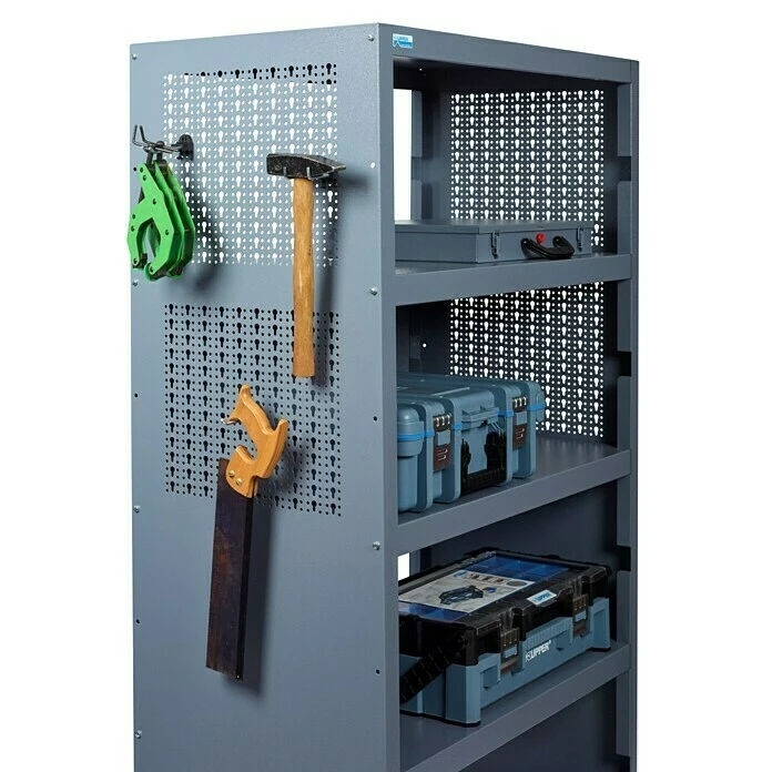 Das Metallregal von Küpper verfügt über 5 stabile Fachböden mit einer Tragkraft von 75 kg/Boden bei verteilte Last. Die Fachböden sind in unterschiedlichen Positionen einschraubbar. Seitliche Schlüssellochung zur Verwendung aller Küpper Systemhalter machen dieses Regal zu einer idealen Ergänzung für die Küpper Werkstattserie. Optisch und farblich passend zu den Werkbänken und Hochschränken. Der Fachboden kann auf die exakt gleiche Höhe der Werkbank-Bodenbleche gebracht werden. Zudem sind die Maße identisch (Höhe). Dadurch ergibt sich ein optisch sehr schönes Gesamtbild in Ihrer Werkstatt.