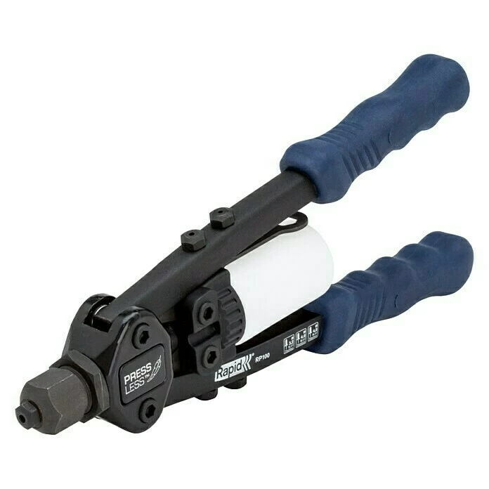 Die Blindnietzange RP100 von Rapid ist eine präzise arbeitende, besonders leistungsstarke Nietzange, die mit der einzigartigen Press-Less Technologie zur Reduzierung des benötigten Kraftaufwands ausgestattet ist. Sie ist das richtige Werkzeug zur Verarbeitung von Nieten aus Aluminium und Edelstahl mit einem Durchmesser von 3,2 mm, 4 mm und 4,8 mm. Der Griffhebel mit Softgrip sowie das leichte Aluminiummaterial sorgen für hohen Bedienkomfort, auch über einen längeren Zeitraum. Der Wechsel der gehärteten Mundstücke erfolgt ganz bequem mit Hilfe des integrierten Montageschlüssels und der integrierte Nietdornauffangbehälter sorgt für einen sauberen Arbeitsplatz. Mit der Blindnietzange RP100 erledigen Sie selbst langwierigste Aufgaben mühelos und ohne Ermüdungserscheinungen.