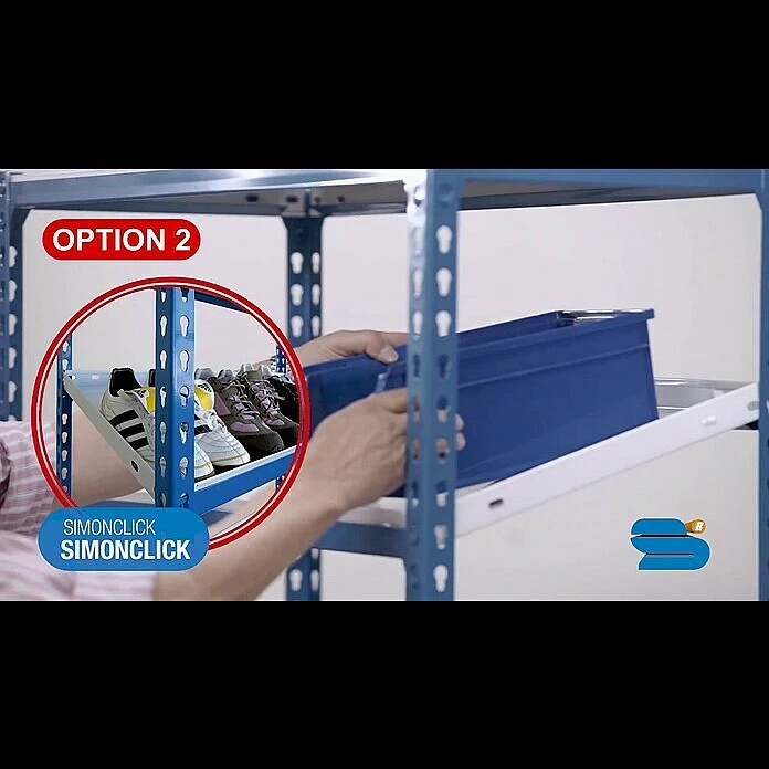 Das Steckregal Simonclick von Simon Rack ist ein flexibles Schwerlastregal das in unterschiedlichen Größen, mit einer unterschiedlichen Anzahl an Böden und in verschiedenen Farben erhältlich ist. Die mit 180 kg belastbaren Böden werden über Traversen im Regal befestigt und lassen sich schräg oder horizontal montieren. Gleichzeitig können die Böden gedreht werden um beispielsweise Schuhe oder rollbare Gegenstände zu lagern. Dank des praktischen Stecksystems lässt sich das Regal schnell und einfach montieren. Somit bietet es professionellen Stauraum auf hohem Niveau.